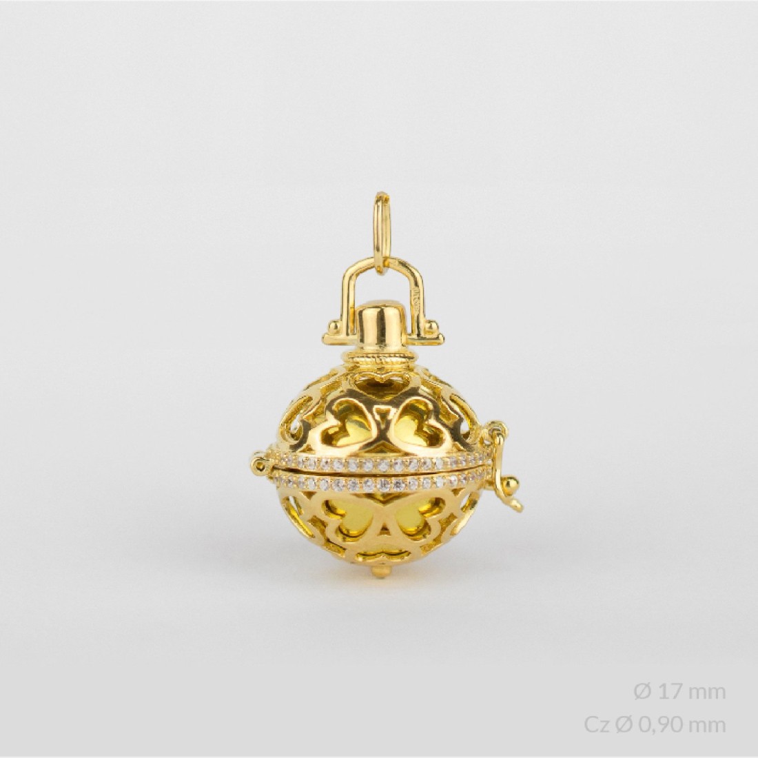 Llamador de ángel de Plata de Ley chapado en oro con circonitas. El llamador de ángel ayuda a calmar al bebé y a crear un vínculo muy especial entre él y la futura mamá. Se lleva a partir del cuarto mes, cuando el bebé desarrolla su audición y podrá escuchar la melodía del llamador. Es un símbolo de protección y calma.